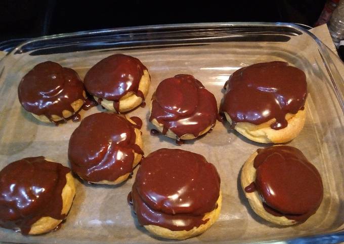 - Percer un petit trou sous chaque choux, les farcir de crème et les couvrir de chocolat.