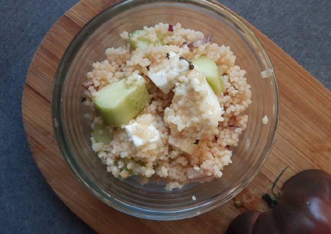 Taboulé feta-menthe. Un taboulé rafraîchissant au concombre, Feta et à la menthe. A servir très frais en entrée estivale. Salade composée gourmande à base de taboulé, de feta et de menthe associé à de la tomate.